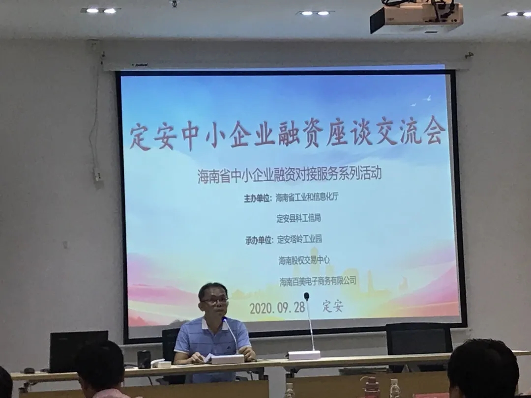 9月28日下午,由海南省工業(yè)和信息化廳、定安縣科工信局主辦,海南股交、定安塔嶺工業(yè)園、海南百美電子商務(wù)有限公司聯(lián)合承辦的“定安縣中小企業(yè)融資座談交流會”在定安舉辦。
