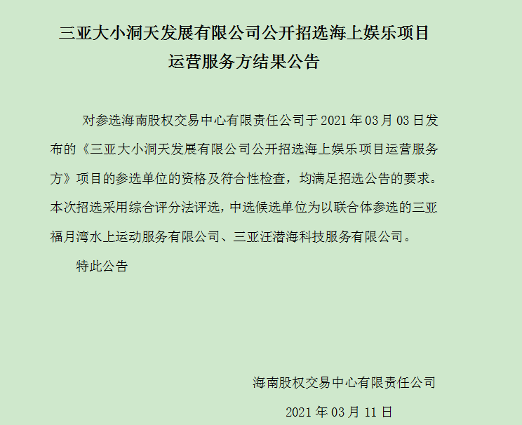 三亞大小洞天發(fā)展有限公司公開招選海上娛樂項目運營服務方結果公告